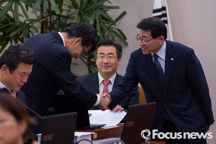 (서울=포커스뉴스) 심재권(오른쪽) 국회 외교통일위원회 위원장이 22일 오전 서울 여의도 국회에서 열린 '외교통일위원회 전체회의'에 참석해 윤상현 새누리당 위원과 악수 하고 있다.