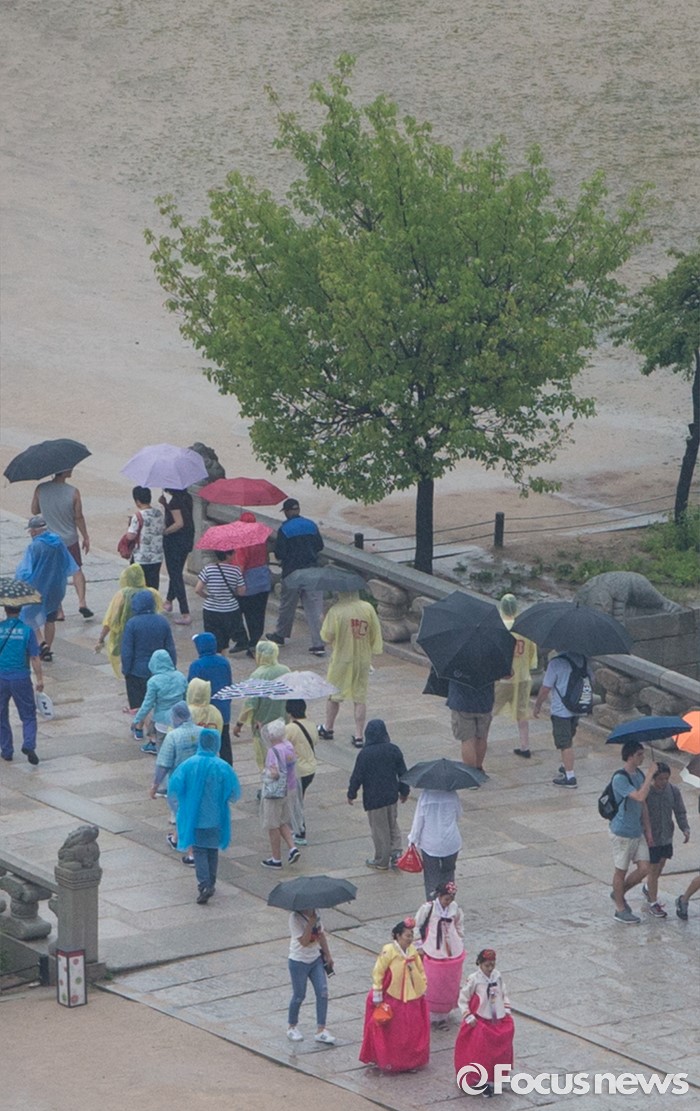 (서울=포커스뉴스) 중부지방에 첫 장맛비가 내리는 22일 오후 서울 경복궁에서 관광객들이 빗줄기 속에 나들이를 즐기고 있다. 기상청은 이번 장마전선이 오늘 밤 다시 남하해 비가 소강상태를 보였다가 모레 다시 북상할 것으로 전망했다.