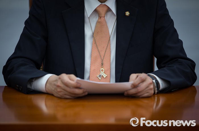 (서울=포커스뉴스) 우상호 더불어민주당 원내대표가 22일 오후 서울 여의도 국회에서 열린 더불어민주당 세월호 TF 회의에서 세월호 참사 유가족이 만든 목걸이를 목에 걸고 있다.