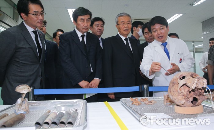 (서울=포커스뉴스) 김종인 더불어민주당 비대위 대표와 의원들이 22일 오후 서울 동작구 국립서울현충원 내 국방부 유해발굴감식단 중앙감식소를 방문해 감식 중인 유해를 살펴보고 있다.