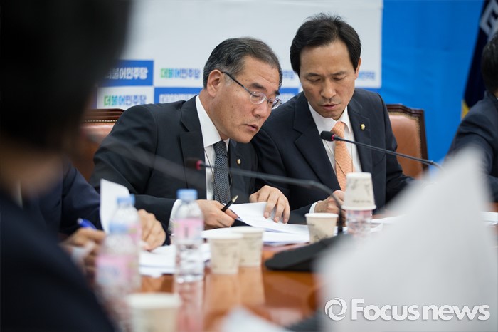 (서울=포커스뉴스) 우상호(오른쪽) 더불어민주당 원내대표가 22일 오후 서울 여의도 국회에서 열린 더불어민주당 세월호 TF 회의에 참석해 이개호 TF 위원장과 대화하고 있다.