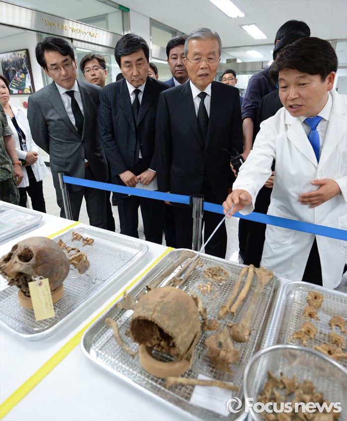 (서울=포커스뉴스) 김종인 더불어민주당 비대위 대표와 의원들이 22일 오후 서울 동작구 국립서울현충원 내 국방부 유해발굴감식단 중앙감식소를 방문해 감식 중인 유해를 살펴보고 있다.