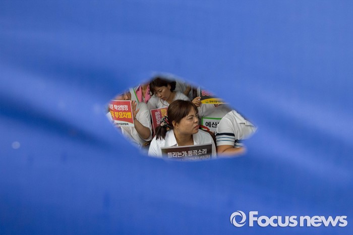 (서울=포커스뉴스) 22일 오후 서울 여의도 산업은행 본점 후문에서 한국가정어린이집연합회 비대위가 주최하는 '맞춤형 복지 시행 반대 단식 농성'이 열리고 있다.