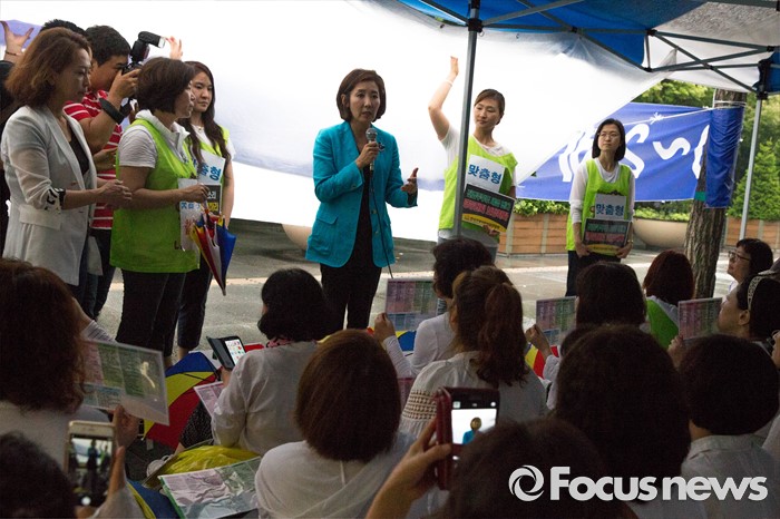 (서울=포커스뉴스) 22일 오후 서울 여의도 산업은행 본점 후문에서 한국가정어린이집연합회 비대위가 주최하는 '맞춤형 복지 시행 반대 단식 농성'이 열리고 있다.