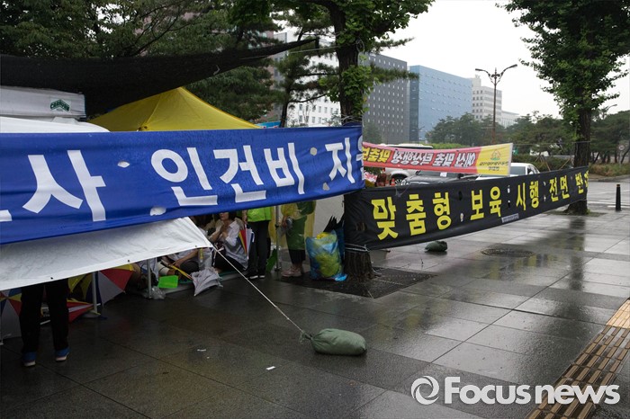 (서울=포커스뉴스) 22일 오후 서울 여의도 산업은행 본점 후문에서 한국가정어린이집연합회 비대위가 주최하는 '맞춤형 복지 시행 반대 단식 농성'이 열리고 있다.