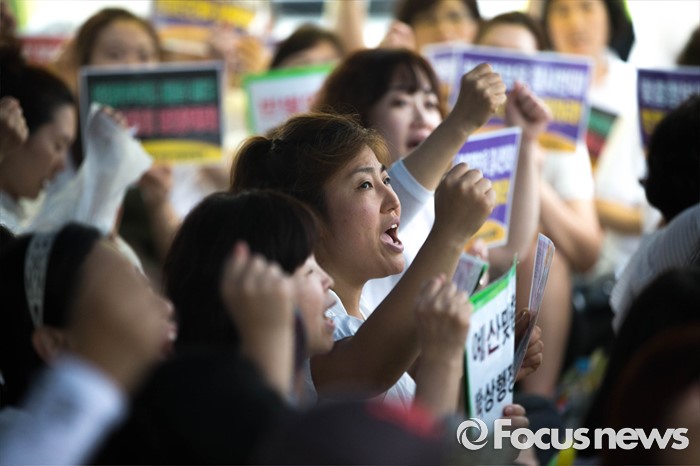 (서울=포커스뉴스) 22일 오후 서울 여의도 산업은행 본점 후문에서 한국가정어린이집연합회 비대위가 주최하는 '맞춤형 복지 시행 반대 단식 농성'이 열리고 있다.