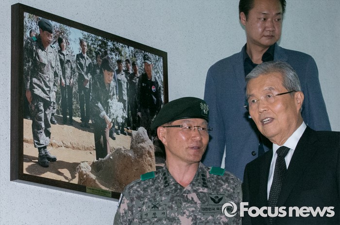 (서울=포커스뉴스) 김종인(오른쪽) 더불어민주당 비대위 대표가 22일 오후 서울 동작구 국립서울현충원 내 국방부 유해발굴감식단을 방문해 이학기 단장의 설명을 들으며 이동하고 있다. 옆에 걸린 사진은 박근혜 대통령의 대선 후보 시절 사진.
