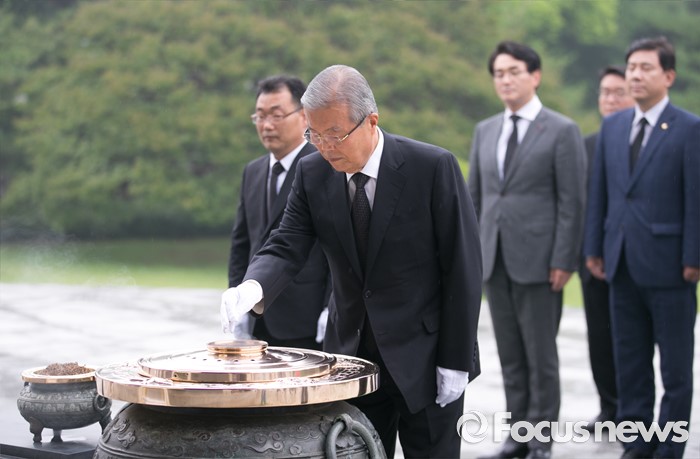 (서울=포커스뉴스) 김종인 더불어민주당 비대위 대표와 의원들이 22일 오후 서울 동작구 국립서울현충원 내 국방부 유해발굴감식단 방문에 앞서 현충탑 참배를 하고 있다.
