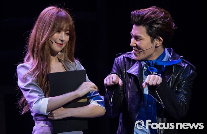 (서울=포커스뉴스) 22일 오후 서울 종로구 홍익대학고 대학로 아트센터에서 열린 뮤지컬 '올슉업' 프레스콜에 참여한 배우 송주희(왼쪽)와 김성규가 주요장면을 시연하고 있다.