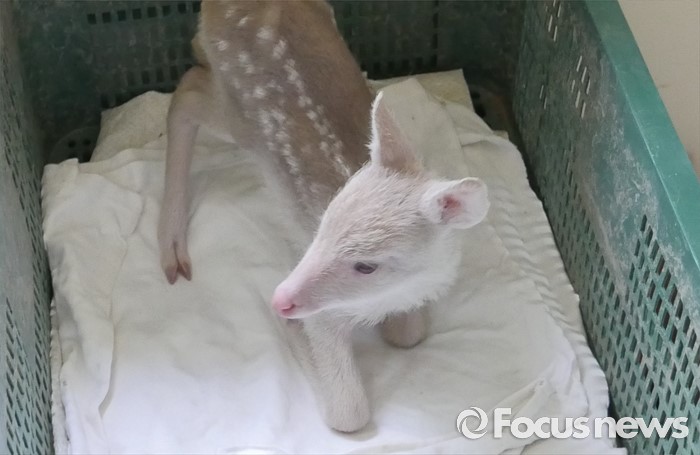(파주 포커스뉴스) 23일 오전 경기도 파주시 문산읍 강현철씨의 농막에서 지난 19일 구조된 흰고라니새끼가 하루가 다르게 성장하고 있다. <사진제공=노영대 한국자연정보원 원장>