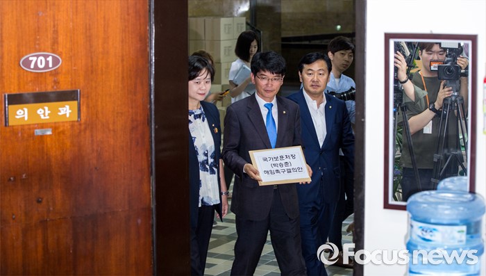 (서울=포커스뉴스) 야3당 원내수석부대표들이 23일 오전 서울 여의도 국회에서 박승춘 국가보훈처장 해임촉구결의안을 제출하기 위해 의안과로 들어서고 있다. 왼쪽부터 이정미 정의당 원내수석부대표, 박완주 더불어민주당 원내수석부대표, 김관영 국민의당 원내수석부대표.