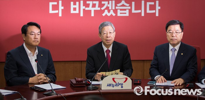 (서울=포커스뉴스) 김희옥 새누리당 혁신위원장이 23일 오전 서울 여의도 새누리당 당사에서 열린 혁신비상대책위원회 회의에서 모두발언 하고 있다. 왼쪽부터 정진석 원내대표, 김 위원장, 김광림 정책위의장