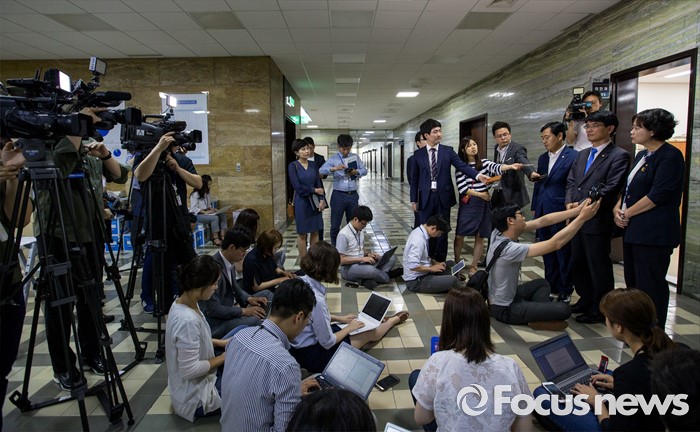 (서울=포커스뉴스) 야3당 원내수석부대표들이 23일 오전 서울 여의도 국회 의안과에서 박승춘 국가보훈처장 해임촉구결의안을 전달한 뒤 취재진 질문에 답하고 있다. 왼쪽부터 이정미 정의당 원내수석부대표, 박완주 더불어민주당 원내수석부대표, 김관영 국민의당 원내수석부대표.