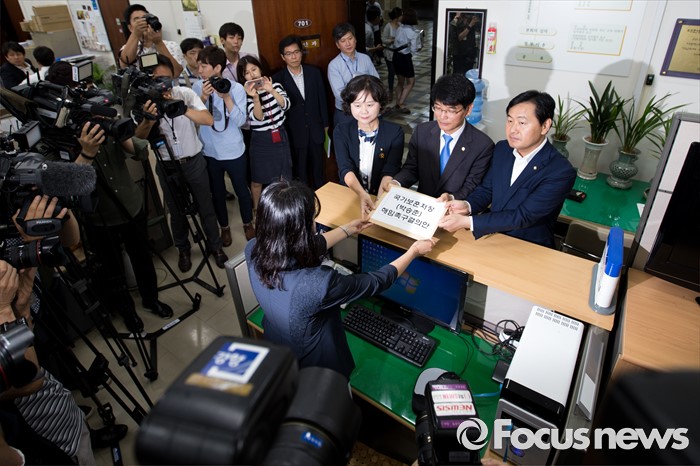 (서울=포커스뉴스) 야3당 원내수석부대표들이 23일 오전 서울 여의도 국회 의안과에서 박승춘 국가보훈처장 해임촉구결의안을 전달 하고 있다. 왼쪽부터 이정미 정의당 원내수석부대표, 박완주 더불어민주당 원내수석부대표, 김관영 국민의당 원내수석부대표.