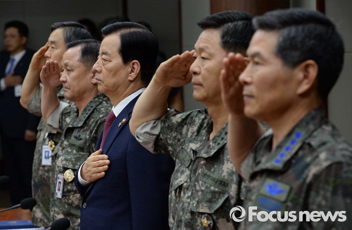 (서울=포커스뉴스) 북한이 무수단급 중거리 탄도미사일을 발사한 다음날인 23일 오전 서울 용산구 국방부 대회의실에서 열린 '2016년 전반기 전군 주요지휘관 회의'에 참석한 한민구(가운데) 국방부 장관과 전군 지휘관들이 국민의례를 하고 있다.
