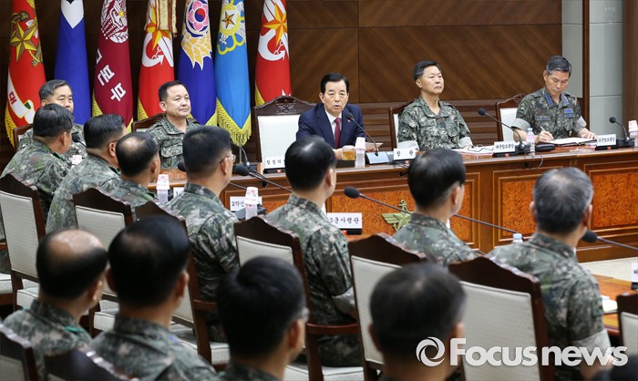 (서울=포커스뉴스) 북한이 무수단급 중거리 탄도미사일을 발사한 다음날인 23일 오전 서울 용산구 국방부 대회의실에서 열린 '2016년 전반기 전군 주요지휘관 회의'에 참석한 한민구 국방부 장관이 모두발언 하고 있다.