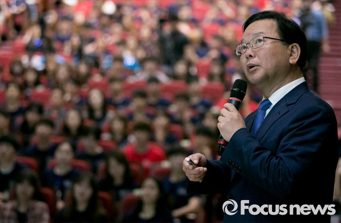 (서울=포커스뉴스) 전당대회 불출마를 선언하고 대권 도전을 시사한 김부겸 더불어민주당 의원이 23일 오전 서울 여의도 국회 의원회관에서 열린 대학생리더십 아카데미에 참석해 특강을 하고 있다.