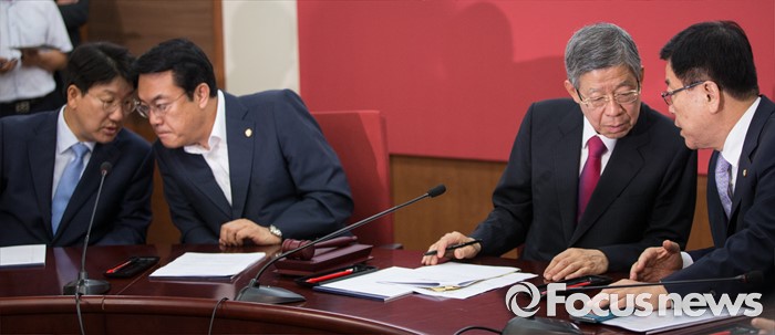 (서울=포커스뉴스) 23일 오전 서울 여의도 새누리당 당사에서 열린 혁신비상대책위원회 회의에서 정진석(왼쪽 두번째) 새누리당 원내대표와 권성동 사무총장이 김희옥(오른쪽 두번째) 혁신위원장과 김광림 정책위의장이 각각 대화하고 있다.