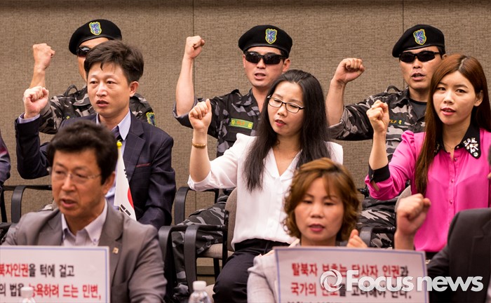 (서울=포커스뉴스) 23일 오전 서울 중구 프레스센터에서 열린 '12명 탈북민들을 사지로 내모는 민변 규탄 및 고발' 기자회견에서 탈북민단체연합 회원들이 민변을 규탄하는 구호를 외치고 있다.
