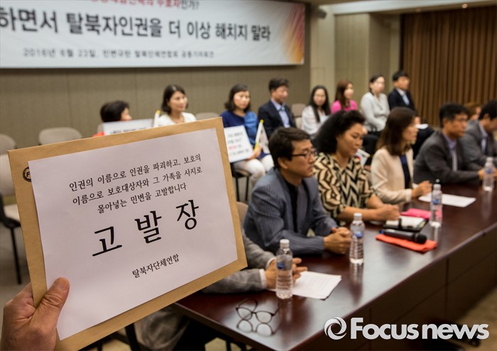 (서울=포커스뉴스) 23일 오전 서울 중구 프레스센터에서 열린 '12명 탈북민들을 사지로 내모는 민변 규탄 및 고발' 기자회견에서 탈북민단체연합 회원들이 고발장을 공개하고 있다.