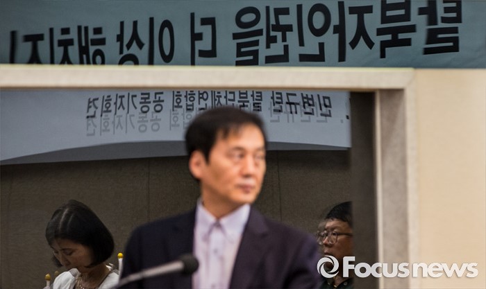 (서울=포커스뉴스) 23일 오전 서울 중구 프레스센터에서 탈북민단체연합 회원들이 '12명 탈북민들을 사지로 내모는 민변 규탄 및 고발' 기자회견을 갖고 있다.