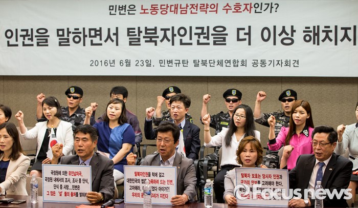 (서울=포커스뉴스) 23일 오전 서울 중구 프레스센터에서 열린 '12명 탈북민들을 사지로 내모는 민변 규탄 및 고발' 기자회견에서 탈북민단체연합 회원들이 민변을 규탄하는 구호를 외치고 있다.