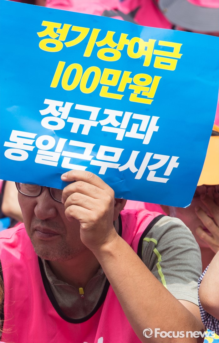 (서울=포커스뉴스) 23일 오전 서울 종로구 서울시 교육청 인근에서 전국학교비정규직 노동조합원과 공공운수노조 전국 교육공무직 본부원들이 '학교급식 인원보강 및 처우개선 철야대기 학교비정규직 처우개선 임단협 승리 총파업 결의대회' 를 하고 있다.