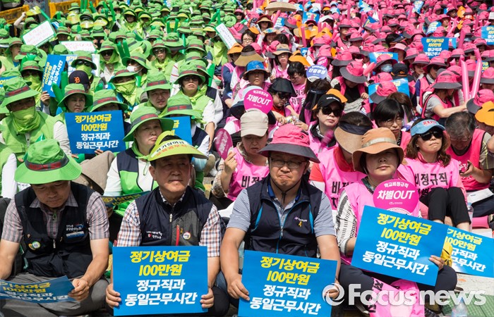 (서울=포커스뉴스) 23일 오전 서울 종로구 서울시 교육청 인근에서 전국학교비정규직 노동조합원과 공공운수노조 전국 교육공무직 본부원들이 '학교급식 인원보강 및 처우개선 철야대기 학교비정규직 처우개선 임단협 승리 총파업 결의대회' 를 하고 있다.