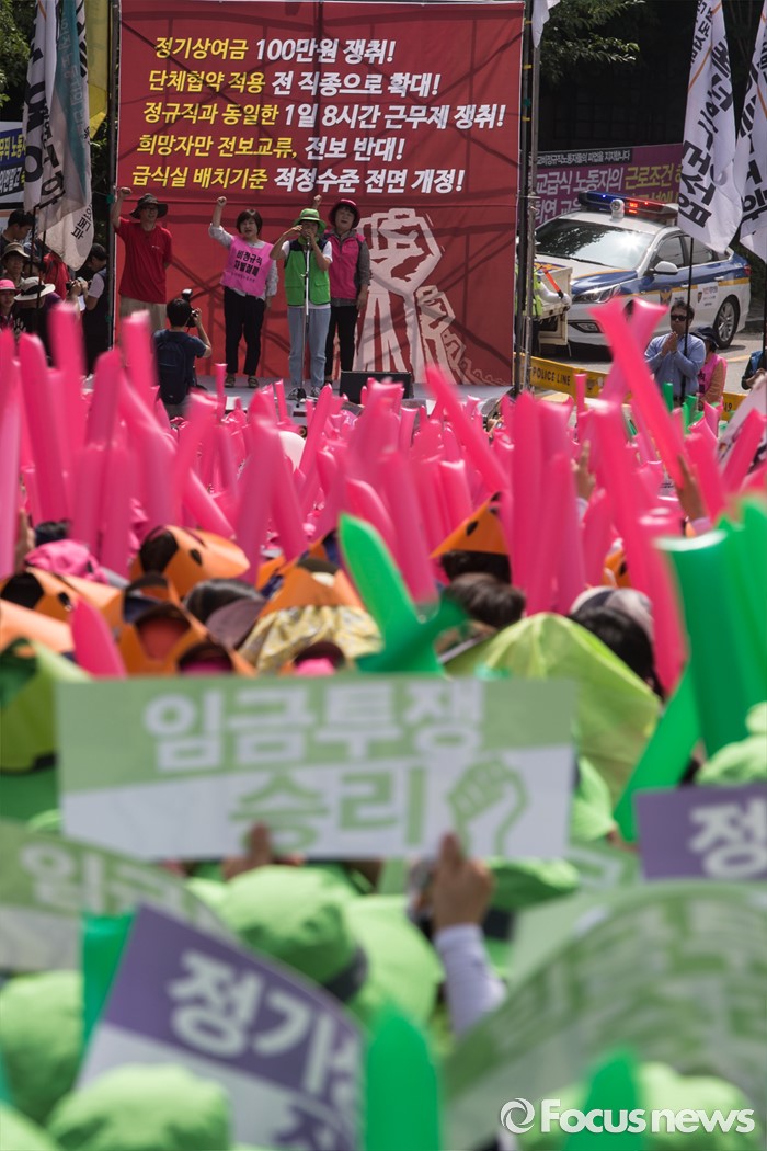 (서울=포커스뉴스) 23일 오전 서울 종로구 서울시 교육청 인근에서 전국학교비정규직 노동조합원과 공공운수노조 전국 교육공무직 본부원들이 '학교급식 인원보강 및 처우개선 철야대기 학교비정규직 처우개선 임단협 승리 총파업 결의대회' 를 하고 있다.