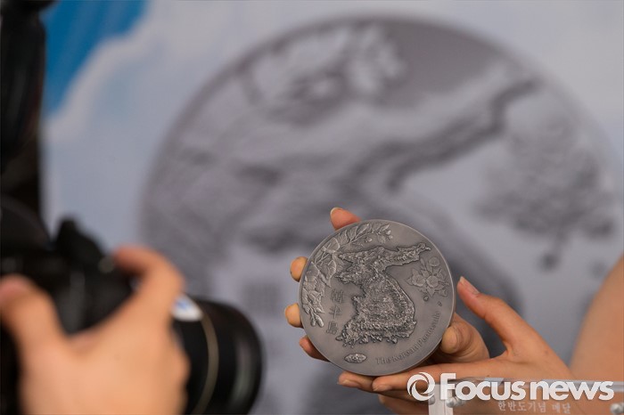 (서울=포커스뉴스) 23일 오전 서울 용산구 전쟁기념관에서 모델들이 한국조폐공사가 6.25전쟁 66주년을 맞아 출시한 '한반도 기념메달'을 들고 포즈를 취하고 있다.