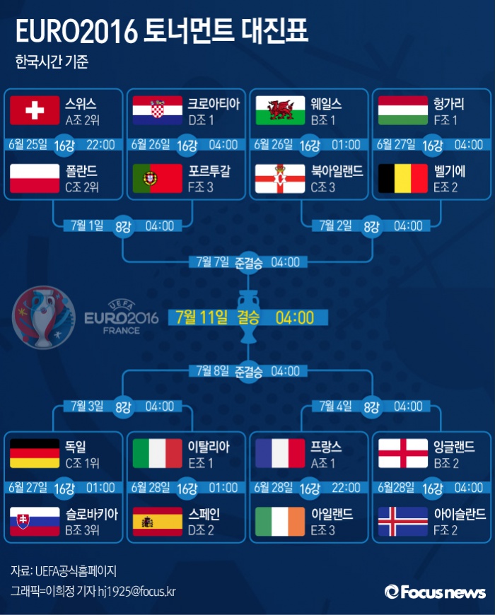 (서울=포커스뉴스) 23일(이하 한국시간) 2016 유럽축구선수권대회 16강 대진표가 확정됐다. 유로2016는 오는 25일 오후 10시 폴란드와 스위스의 16강전 경기를 시작으로 공식 일정을 재개한다.