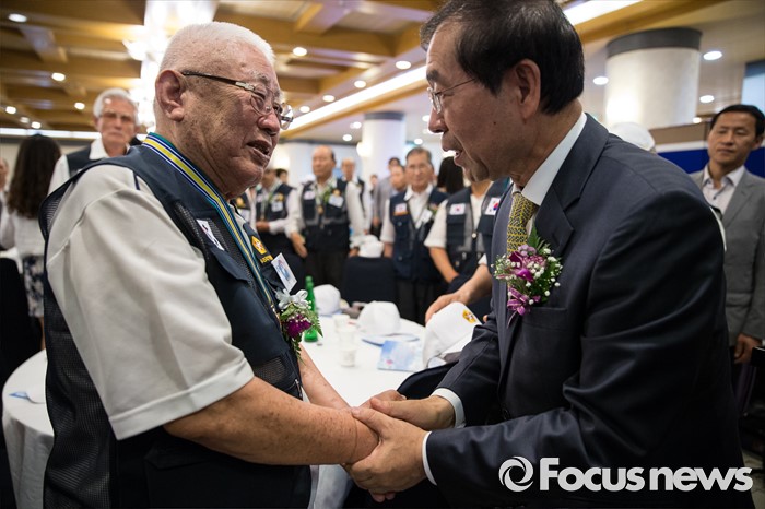 (서울=포커스뉴스) 23일 오전 서울 용산구 전쟁기념관 뮤지엄 웨딩홀에서 열린 '6.25전쟁 참전유공자 위로연 및 호국영웅기장 전수식'에 참석한 박원순(오른쪽) 서울시장이 참전유공자의 손을 잡고 있다.
