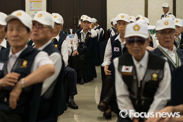 (서울=포커스뉴스) 23일 오전 서울 용산구 전쟁기념관 뮤지엄 웨딩홀에서 참전유공자들이 '6.25전쟁 참전유공자 위로연 및 호국영웅기장 전수식'에 참석하고 있다.