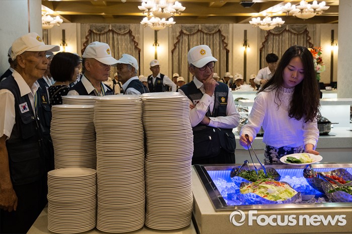 (서울=포커스뉴스) 23일 오전 서울 용산구 전쟁기념관 뮤지엄 웨딩홀에서 참전유공자들이 '6.25전쟁 참전유공자 위로연'에 참석해 식사를 준비하고 있다.