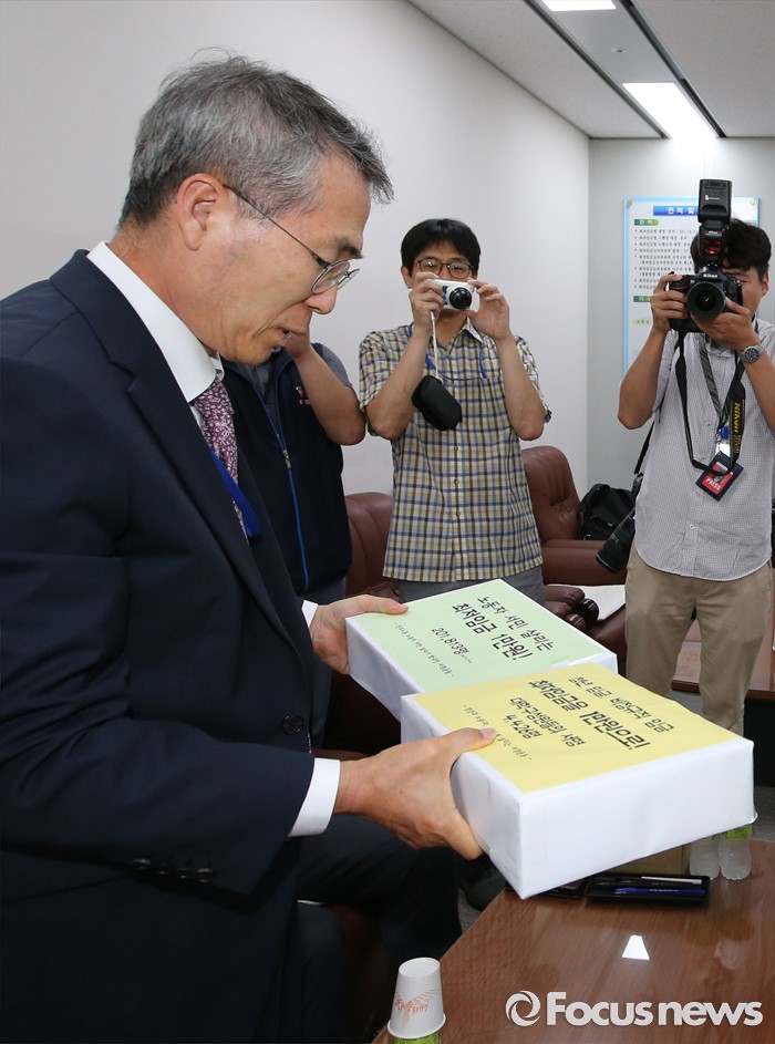 (세종=포커스뉴스) 박준성 최저임금위원회 위원장이 23일 오후 세종시 정부세종청사 고용노동부 최저임금위원장실에서 최종진 민주노총 위원장 직무대행과 관계자들로부터 최저임금 1만원 서명지를 받고 있다.