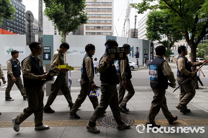 (서울=포커스뉴스) 23일 오후 서울 영등포구 KDB 산업은행 앞에서 STX조선해양노조원들이 일방적 조선업 구조조정 중단 및 공적자금 사용 내역 공개 요구 결의대회를 마치고 한영회게법인으로 행진하고 있다.