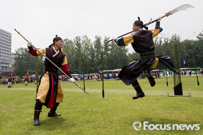 서울=포커스뉴스) 23일 오후 서울광장에서 열린 '왕궁수문장 20주년 기념행사'에 참석한 국방부 전통의장대원들이 무예 시범을 보이고 있다.