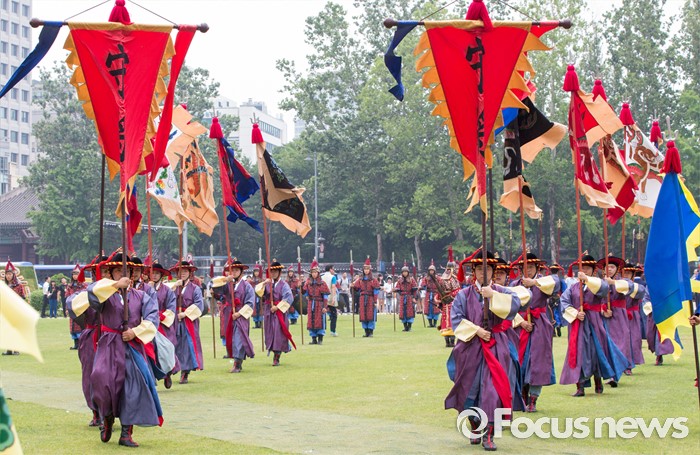 (서울=포커스뉴스) 23일 오후 서울광장에서 열린 '왕궁수문장 20주년 기념행사'에 참석한 관계자들이 대열의식을 재현하고 있다.