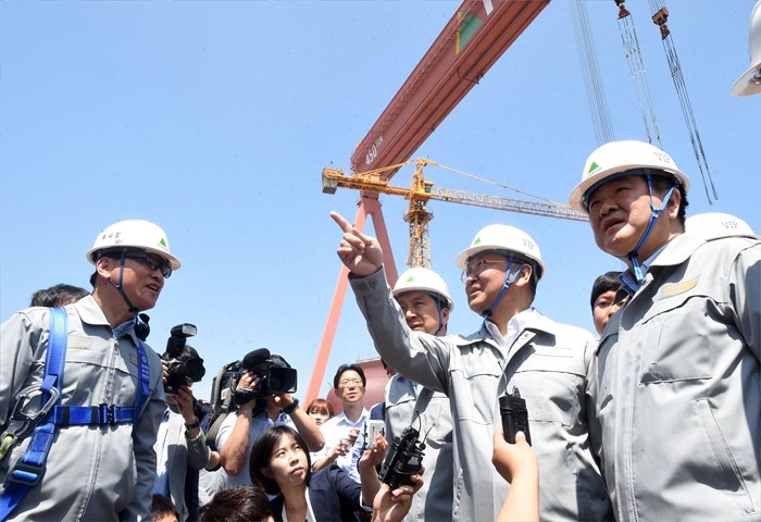 (울산=포커스뉴스) 유일호 부총리 겸 기획재정부 장관이 23일 구조조정 관련 현장방문으로 현대중공업 울산조선소에서 관계자로부터 선박건조 현장 설명을 듣고 있다. <사진제공=기획재정부>