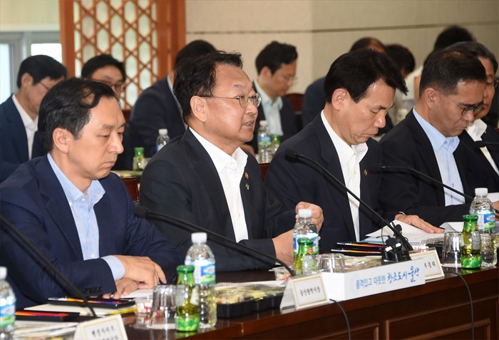 (울산=포커스뉴스) 유일호 부총리 겸 기획재정부 장관이 23일 구조조정 관련 현장방문으로 현대중공업 울산조선소에서 선박건조 현장을 둘러본 후 울산시청에서 유관기관 및 기업들과의 간담회를 갖고 있다. <사진제공=기획재정부>