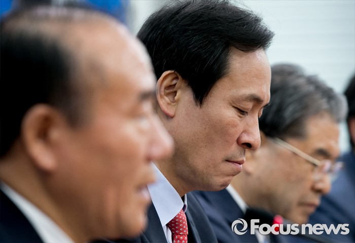 (서울=포커스뉴스) 23일 오후 서울 여의도 국회에서 열린 누리과정 및 지방교육재정 해결 위한 전국시도교육감협의회와 간담회에 참석한 우상호(가운데) 더불어민주당 원내대표가 장휘국(왼쪽) 전국시도교육감협의회장(광주시교육감)의 인사말을 듣고 있다.