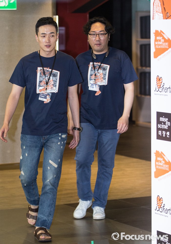 (서울=포커스뉴스) 23일 오후 서울 마포구 롯데시네마 홍대입구점에서 열린 '제15회 미쟝센 단편영화제' 개막 포토월 행사에 참여한 이병헌(왼쪽) 감독과 권혁제 감독이 포토타임을 위해 이동하고 있다.