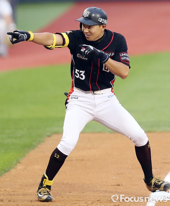 (서울=포커스뉴스) 23일 서울 잠실구장에서 열린 2016 프로야구 kt-두산 경기 2회초 1사 1,2루에서 kt 이대형이 우익선상으로 빠지는 주자 일소 3루타를 치고 덕아웃을 향해 세리머니를 하고 있다.