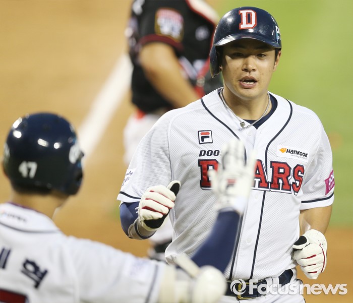 (서울=포커스뉴스) 23일 서울 잠실구장에서 열린 2016 프로야구 kt-두산 경기 4회말 2사 2루에서 두산 허경민의 우전 안타때 2루주자 김재환이 홈인하고 있다.