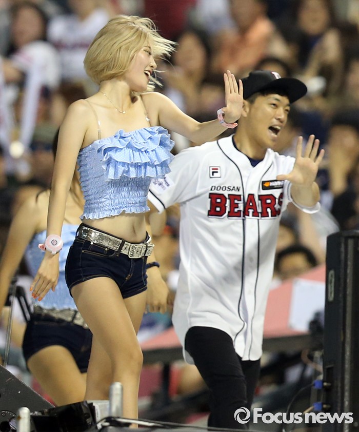 (서울=포커스뉴스) 23일 서울 잠실구장에서 열린 2016 프로야구 kt-두산 경기에서 두산 치어리더와 치어보이가 관중들에게 정열적인 춤을 선사하고 있다.
