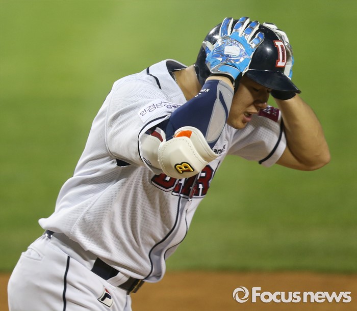 (서울=포커스뉴스) 23일 서울 잠실구장에서 열린 2016 프로야구 kt-두산 경기 8회말 무사 1루에서 두산 김재환이 2루쪽 플라이를 치고 헬맷을 감싸 쥐고 뛰어 나가고 있다.