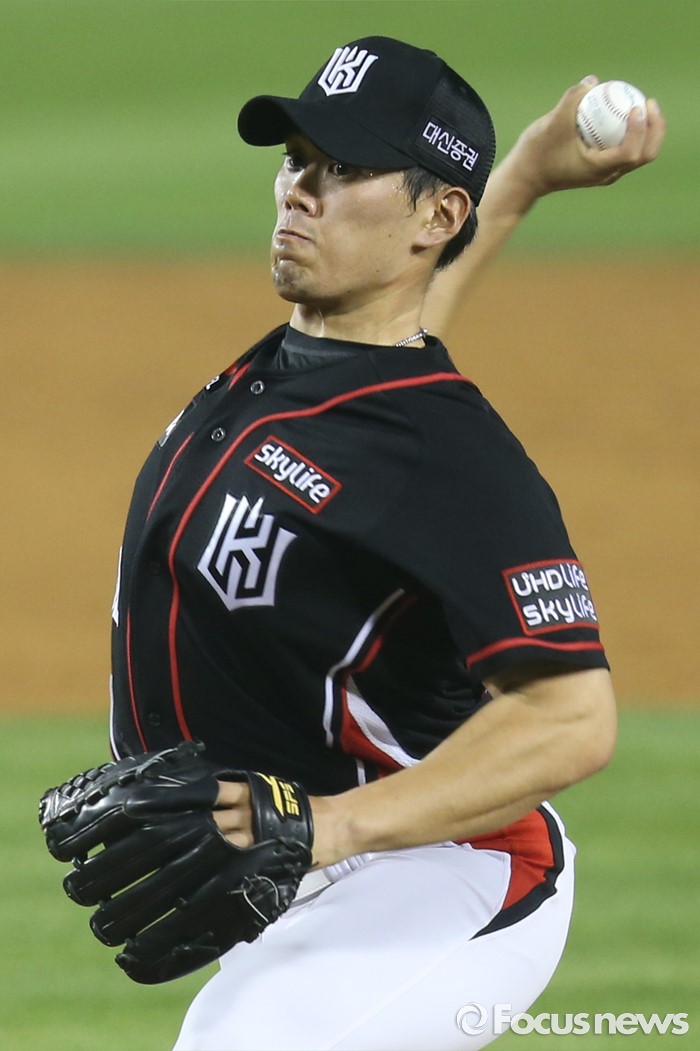 (서울=포커스뉴스) 23일 서울 잠실구장에서 열린 2016 프로야구 kt-두산 경기에서 kt 투수 김재윤이 8회말 2사 1루에서 등판해 투구하고 있다.