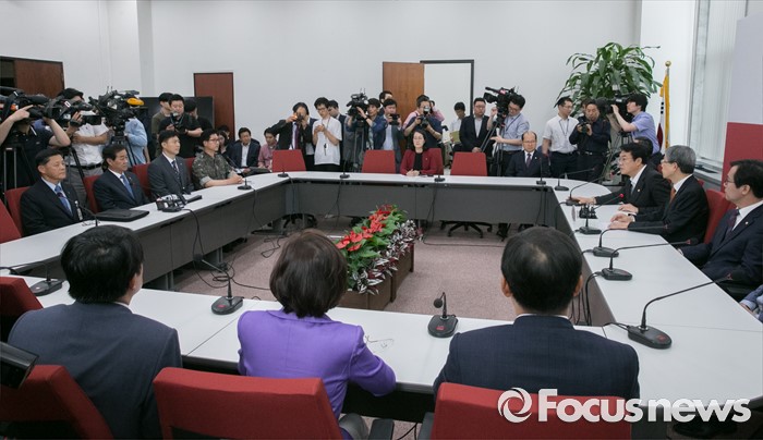 (서울=포커스뉴스) 24일 오전 서울 여의도 국회에서 열린 북한 미사일 발사 관련 국방부 현안보고에 참석한 김희옥 새누리당 혁신비대위원장과 정진석 원내대표 등 의원들이 황인무 국방부 차관 등 관계자들의 보고를 받고 있다.