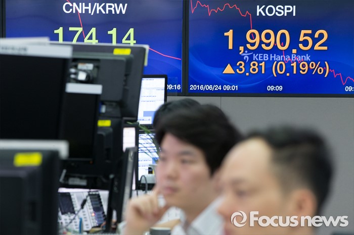(서울=포커스뉴스) 영국의 유럽연합(EU) 탈퇴를 의미하는 '브렉시트' 국민 투표 개표가 진행되는 24일 오전 서울 중구 KEB 하나은행 명동 본점 딜링룸에서 딜러들이 업무를 보고 있다. 이날 코스피지수는 브리메인 기대에 2000p를 돌파했으나 다시 하락해 1900p대를 유지하고 있다.