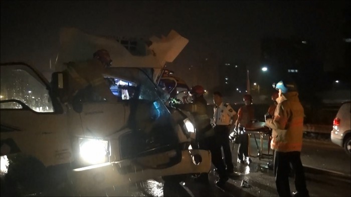 (서울=포커스뉴스) 24일 오전 1시27분쯤 서울 노원구 월계동 동부간선도로 서울방향 월계1교에서 우유를 싣고가던 5톤 냉동탑차가 8톤 우편화물차를 들이받는 사고가 났다.